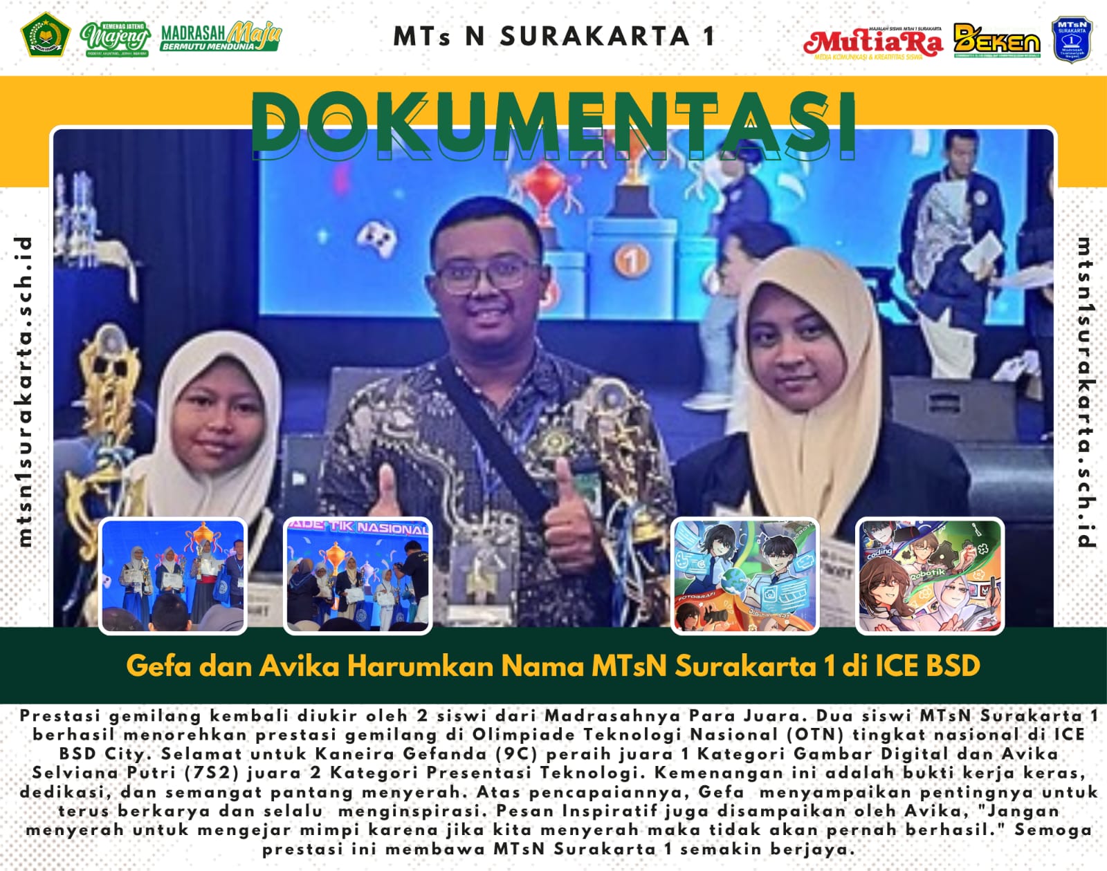 Baru-baru ini, dua siswi berbakat dari MTsN Surakarta 1 berhasil meraih prestasi membanggakan di ajang Olimpiade Teknologi Nasional (OTN) tingkat nasional. Kedua siswi tersebut adalah Kaneira Gefanda dari kelas 9C yang meraih Juara 1 kategori Gambar Digital, serta Avika Selviana Putri dari kelas 7S2 yang berhasil meraih Juara 2 kategori Presentasi Teknologi.