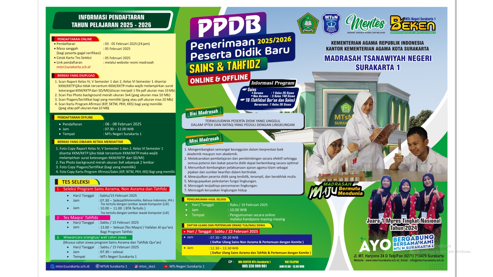 SELAMAT DATANG DI SITUS RESMI MTSN 1 SURAKARTA - SITUS INI MERUPAKAN MEDIA INFORMASI DAN KOMUNIKASI ANTARA PESERTA DIDIK MAUPUN MASYARAKAT UNTUK MENGETAHUI INFORMASI DAN KEGIATAN-KEGIATAN LEBIH LANJUT YANG DILAKSANAKAN DI SATUAN PENDIDIKAN MTSN 1 SURAKARTA