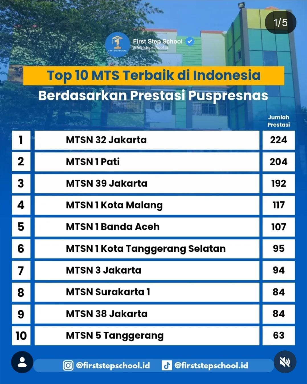 Surakarta — Prestasi membanggakan kembali ditorehkan oleh MTsN 1 Surakarta. Berdasarkan data yang dirilis oleh akun _First Step_ _School,_ madrasah ini berhasil masuk dalam daftar Top 10 MTs Terbaik di Indonesia Berdasarkan Prestasi Puspresnas.