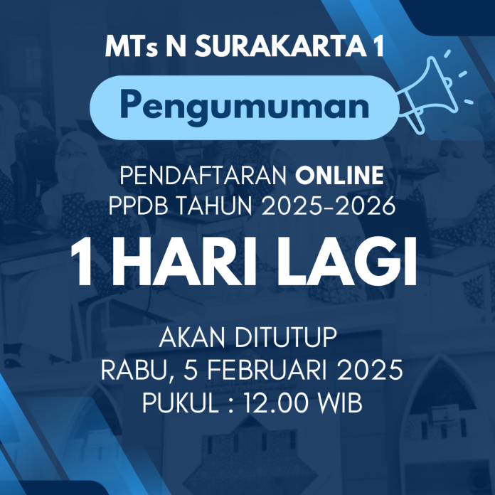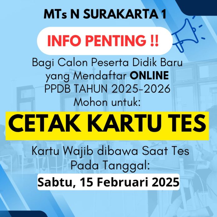 Tes Seleksi hari ini berjalan lancar. Besar harapan peserta tes untuk bergabung di MTsN Surakarta 1. Sejumlah 588 peserta tes berharap menjadi bagian dari madrasahnya para juara. Madrasah yang tidak bisa dipandang sebelah mata. Madrasah yang sarat dengan prestasi akademik dan nonakademiknya. Hal ini terbukti dengan jumlah peserta PPDB MTsN Surakarta 1 yang setiap tahunnya selalu meningkat. “Alhamdulillah pelaksanaan Tes Seleksi PPDB tahap 1 untuk program Sains dan Tahfidz berjalan lancar. Pengumuman akan disampaikan pada tanggal 19 Februari 2025. Masih ada PPDB tahap 2 untuk Program Reguler yang akan digelar pada bulan Juni. Saya berharap Tes Seleksi ini dapat digunakan untuk memilih siswa baru yang berkualitas dan berhak diterima di madrasah ini. Saya juga sangat berharap siswa baru yang terpilih adalah siswa yang unggul dalam iman dan takwa, berbudi pekerti luhur juga unggul di bidang akademik ataupun nonakademik sehingga bisa membawa madrasahnya para juara semakin mendunia,”harap Edi Hartanto, Waka Kesiswaan sekaligus Ketua PPDB. (Tim Jurnalis/Diana)