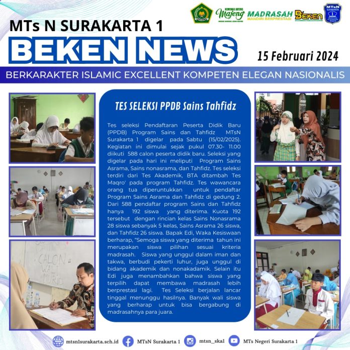 MTsN Surakarta 1 melaksanakan Tes Seleksi PPDB Program Sains dan Tahfidz pada Sabtu (15/02/2025) di gedung 1 dan 2 pada pukul 07.30-11.00. Tes Seleksi diikuti 588 peserta yang akan memperebutkan 192 kursi. Tes terdiri dari Tes Akademik (Bahasa Indonesia, Matematika dan IPA) dari pukul 07.30 – 09.30 dan Tes Baca Tulis Alquran dari pukul 10.00 -11.00. Khusus untuk Program Tahfidz tes dilanjutkan dengan Tes Maqro’ dari pukul 10.00 – selesai. Selain itu ada tes wawancara untuk calon wali siswa Program Sains Asrama dan Tahfidz yang digelar di Gedung 2.