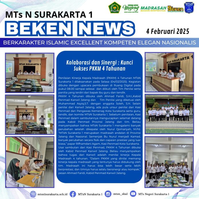 PKKM 4 Tahunan dibuka oleh Ahmad Faridi, S.H.I.,Kabid Penmad Kanwil Jateng dan Tim Penilai yang diketuai oleh Muhammad Asyiq,S.T. dengan anggota Soleh, S.H. Selain penilai dari Kanwil Jateng, ada pula unsur penilai dari Kasi Penmad dan Pengawas Kemenag Kota Surakarta serta guru, tendik, dan komite MTsN Surakarta 1. Sebelum penilaian, Kasi Penmad dalam sambutannya mengucapkan selamat datang pada Kabid Penmad Provinsi Jateng dan tim. Beliau menyampaikan bahwa MTsN Surakarta 1 mengalami banyak perubahan setelah dikepalai oleh Nurul Qomariyah, M.Pd. “MTsN Surakarta 1 merupakan madrasah andalan di Provinsi Jateng dan Nasional. Semenjak Bu Nurul menjadi Kamad, banyak perubahan secara fisik dan capaian prestasi yang luar biasa,” papar Rifhamdani Agam, Kasi Penmad Kota Surakarta.