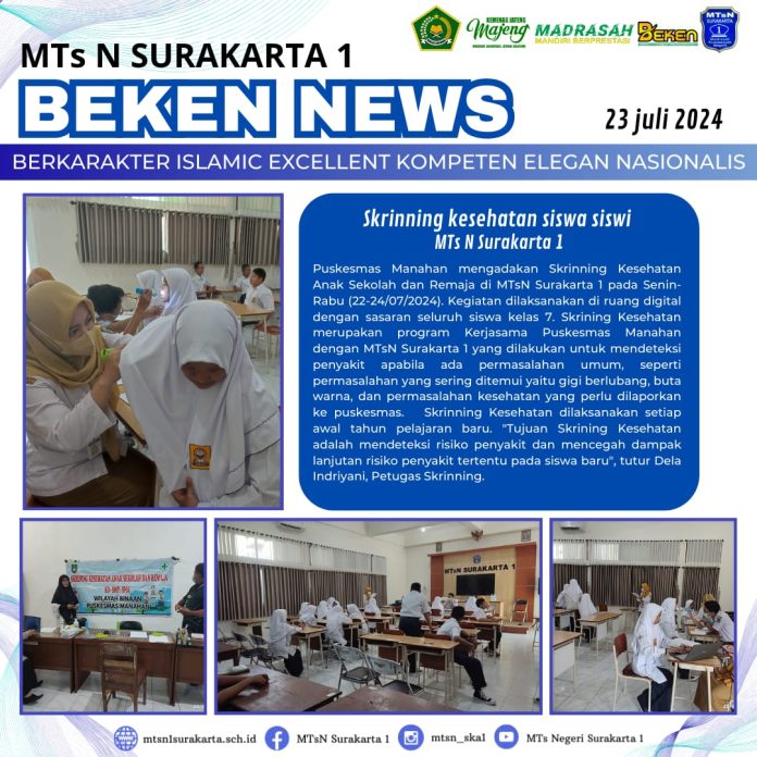 Puskesmas Manahan mengadakan Skrinning Kesehatan Sekolah dan remaja yang diperuntukkan bagi seluruh siswa kelas 7 di MTsN Surakarta. Kegiatan tersebut berlangsung berlangsung di ruang Digital pada hari Senin-Rabu (22-24/07/2024) dimulai pukul 08.00-12.00 dilaksanakan secara bergiliran.