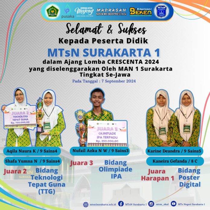 Surakarta- MTsN Surakarta 1 bertabur prestasi pada Sabtu (07/09/2024) di Ajang Cresenta 2024, SEF UNS, dan Kejuaraan Lemkari Jawa Tengah. Prestasi yang berhasil diraih di Ajang crescenta tersebut adalah juara 3 Olimpiade IPA atas nama Nufail Azka Naufa Windarta (9S3), juara 2 Teknologi Tepat Guna atasa nama Aqila Naura Khosy N (9S4) dan Shafa Yumna (9S4), Juara Harapan 1 Poster Digital atas nama Karine Deandra (9S5) dan Kaneira Gefanda (8C). Kemudian juara 2 lomba Poster atas nama Gaudiansyah Abiyu (8S4) di ajang Lomba Science Education Fair (SEF) yang diselenggarakan oleh Prodi Pendidikan IPA UNS. Selain itu, di Ajang Lemkari atas nama Nayaka Anindyo Irawan (9A) berhasil meraih juara 1 Kata Perorangan Kadet Putra dan juara 1 Kata Beregu Kadet Putra.