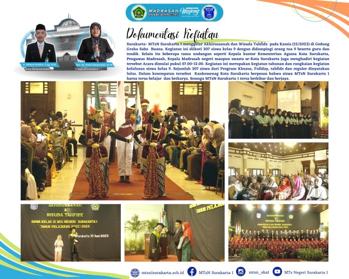 Surakarta- MTsN Surakarta 1 menggelar Akhirussanah dan Wisuda Tahfidz pada Kamis (15/2023) di Gedung Graha Sabha Bhuwana. Kegiatan ini diikuti 307 siswa kelas 9 yang didampingi orang tua, serta guru, dan tendik. Selain itu, beberapa tamu undangan, seperti Kepala Kantor Kementerian Agama Kota Surakarta, Pengawas Madrasah, Kepala Madrasah negeri maupun swasta se-Kota Surakarta turut menghadiri kegiatan tersebut. Acara dimulai pukul 07.00 dan berakhir pada pukul 12.00.